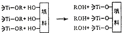 關(guān)于鈦酸酯偶聯(lián)劑的作用機(jī)理,一般認(rèn)為是在單烷氧鈦酸酯偶聯(lián)劑中只有一個(gè)異丙氧基團(tuán)是能和無(wú)機(jī)物偶聯(lián)的水解基團(tuán),因此就可以在無(wú)機(jī)顏、填料的表面形成單分子層(見(jiàn)下圖)